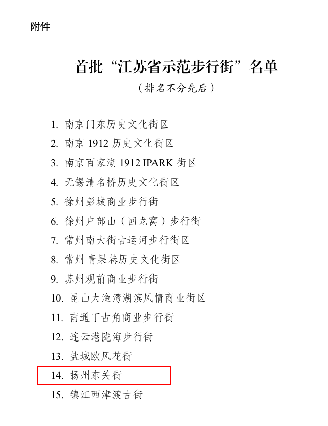 近日,江蘇省商務(wù)廳發(fā)布《省商務(wù)廳關(guān)于公布首批“江蘇省示范步行街”名單的通知》,確認(rèn)揚州東關(guān)街等15條步行街為首批“江蘇省示范步行街”。