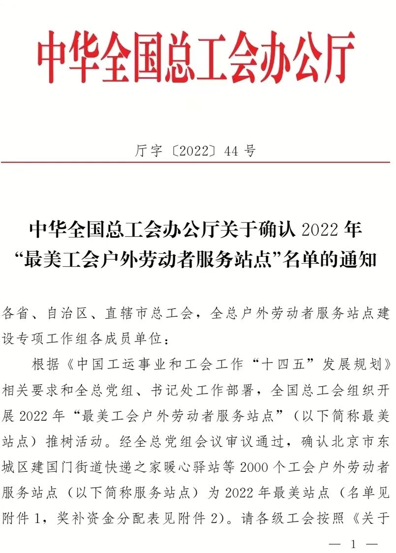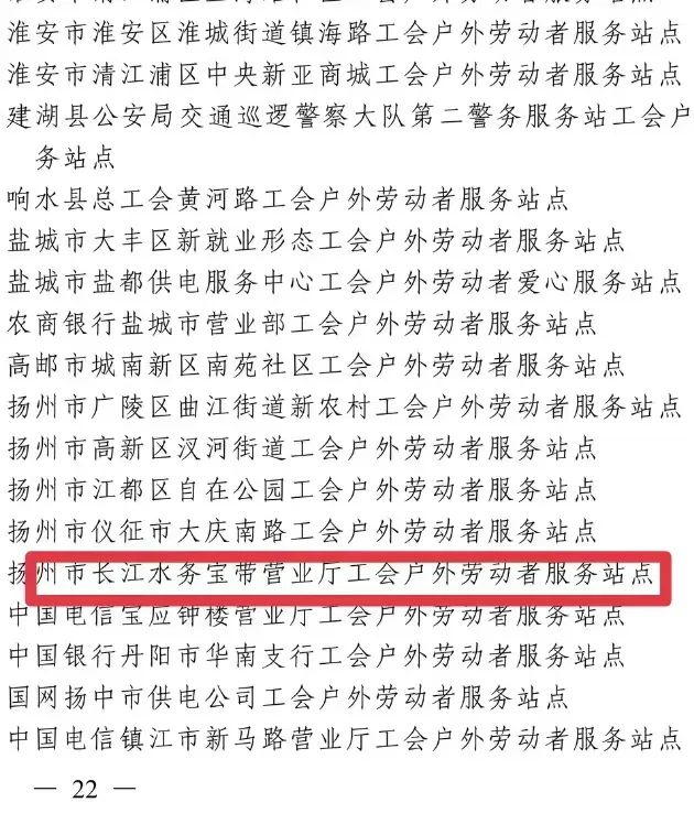 近日,中華全國(guó)總工會(huì)辦公廳發(fā)布2022年“最美工會(huì)戶(hù)外勞動(dòng)者服務(wù)站點(diǎn)”名單,城控集團(tuán)公用事業(yè)服務(wù)中心——長(zhǎng)江水務(wù)寶帶營(yíng)業(yè)廳工會(huì)戶(hù)外勞動(dòng)者服務(wù)站點(diǎn)名列其中,這是揚(yáng)州市總工會(huì)建設(shè)產(chǎn)業(yè)系統(tǒng)唯一一家入選的服務(wù)站點(diǎn)。