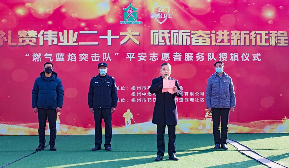為貫徹黨的二十大精神,筑牢燃氣安全防線,為建設平安揚州夯實基礎,12月15日,揚州市平安志愿者總會、揚州中燃公司在邗上街道武塘社區(qū)中心廣場,共同組織開展“禮贊偉業(yè)二十大、砥礪奮進新征程”平安志愿服務活動暨“燃氣藍焰突擊隊”授旗儀式。揚州市公安局二級高級警長、揚州平安志愿者總會副會長俞洪出席活動,為“燃氣藍焰突擊隊”平安志愿服務隊授旗。揚州中燃公司黨委書記、董事長,燃氣安檢員代表參加活動。