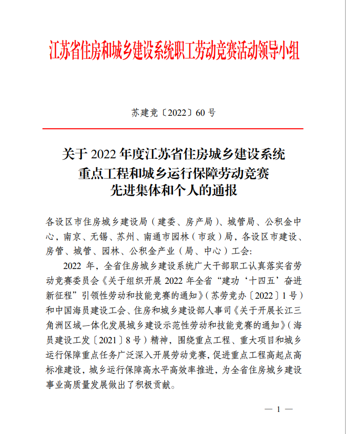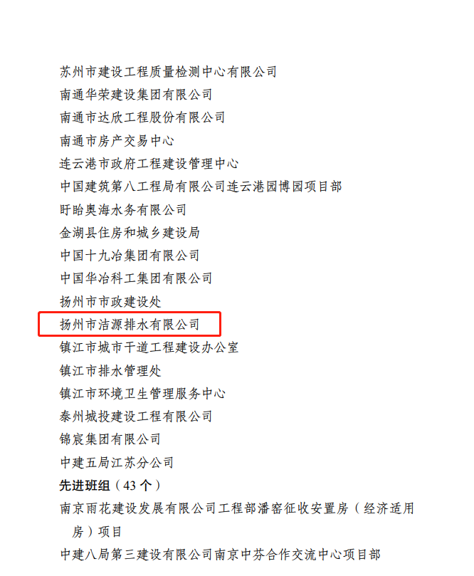 12月30日,從江蘇省住房和城鄉(xiāng)建設(shè)系統(tǒng)職工勞動(dòng)競(jìng)賽活動(dòng)領(lǐng)導(dǎo)小組傳來(lái)喜訊,揚(yáng)州市潔源排水有限公司被表彰為“2022年度江蘇省住房城鄉(xiāng)建設(shè)系統(tǒng)重點(diǎn)工程和城鄉(xiāng)運(yùn)行保障勞動(dòng)競(jìng)賽先進(jìn)集體”。