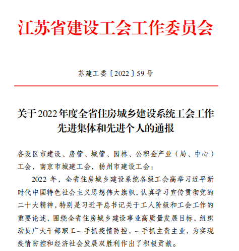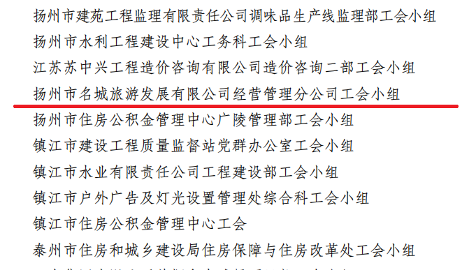 2022年12月30日,江蘇省建設(shè)工會工作委員會發(fā)文表彰省住房和城鄉(xiāng)建設(shè)系統(tǒng)先進集體,揚州市名城旅游發(fā)展有限公司聯(lián)合基層工會經(jīng)營管理分公司工會小組被表彰為“模范職工小家”稱號。