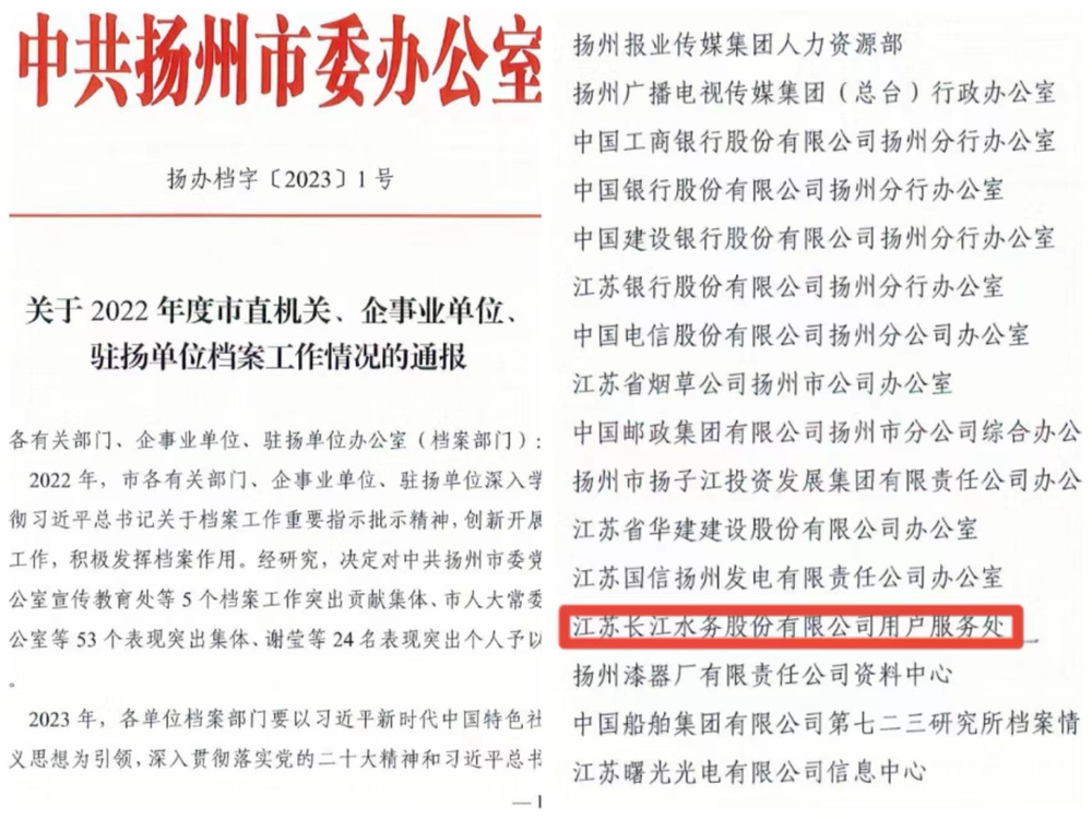 近日,長江水務(wù)公司用戶服務(wù)處獲得中共揚(yáng)州市委辦公室頒發(fā)的“2022年度檔案工作表現(xiàn)突出集體”榮譽(yù)稱號。