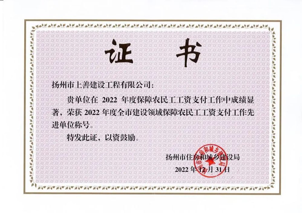 近日,上善公司榮獲2022年度全市建設領域保障農(nóng)民工工資支付工作先進單位稱號。