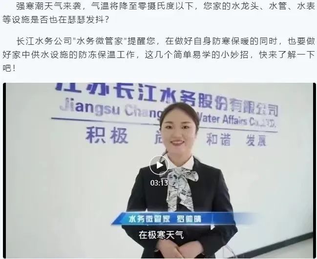 “水務微管家”開通企業(yè)微信平臺,攝制多條微視頻,推送供水服務咨詢,普及自來水知識,與重點用水企業(yè)實現(xiàn)“一對一”線上線下聯(lián)動服務。在寒潮降溫前,通過企業(yè)微信平臺、社區(qū)網(wǎng)格、志愿者服務微信群密集發(fā)布冬季自來水防凍提醒,上門為老年用戶和弱勢群體做好冬季用水設施的防凍保溫措施。
