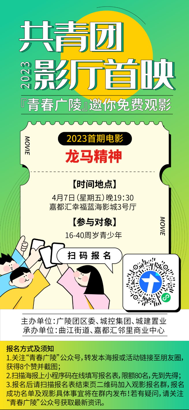 4月7日星期五晚7點半,嘉都匯幸福藍海影城“共青團影廳”將開展首映觀影活動,邀請共青團員、少先隊員、團干部、志愿者等優(yōu)秀青少年群體參加。