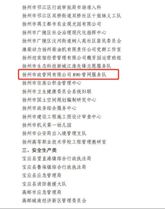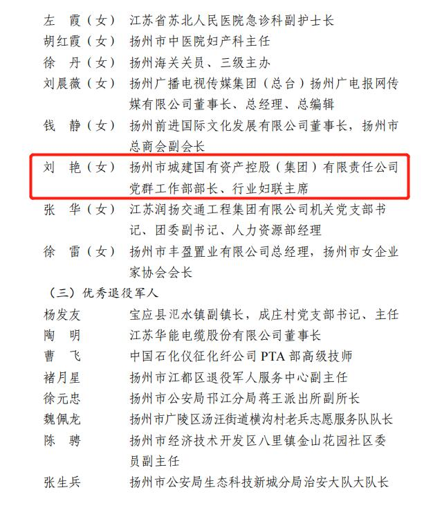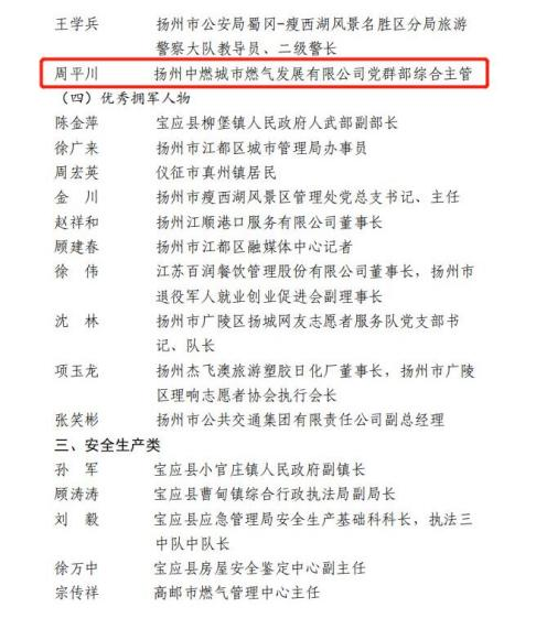 集團(tuán)所屬揚(yáng)州市政管網(wǎng)有限公司890管網(wǎng)服務(wù)隊(duì)獲評(píng)“巾幗模范集體”;集團(tuán)黨群部部長、行業(yè)婦聯(lián)主席劉艷榮獲“巾幗榜樣”榮譽(yù)稱號(hào);集團(tuán)所屬揚(yáng)州中燃城市燃?xì)獍l(fā)展有限公司黨群部主管周平川榮獲“優(yōu)秀退役士兵”榮譽(yù)稱號(hào);集團(tuán)企管部副部長李剛榮獲“安全生產(chǎn)類先進(jìn)個(gè)人”榮譽(yù)稱號(hào)。