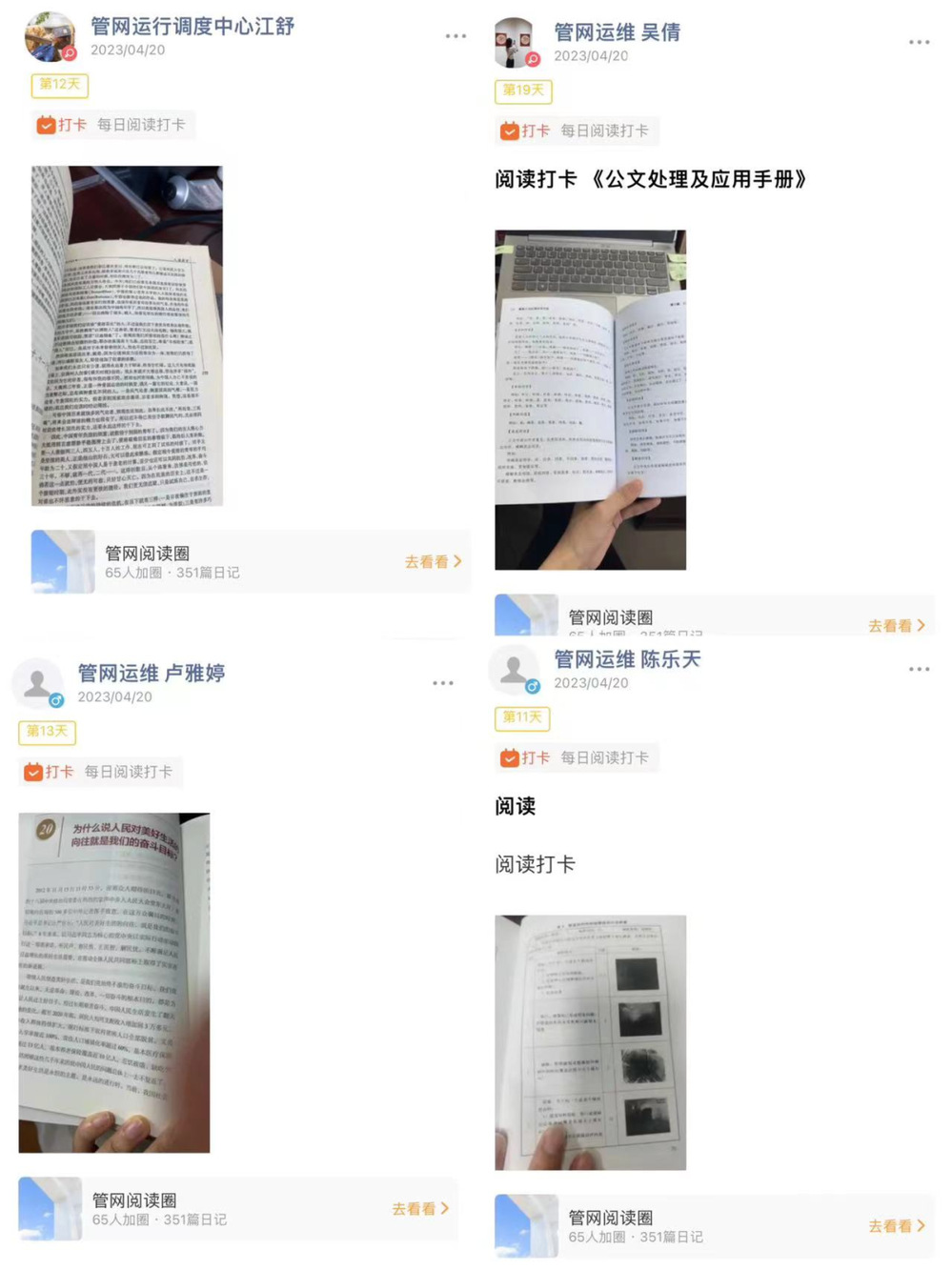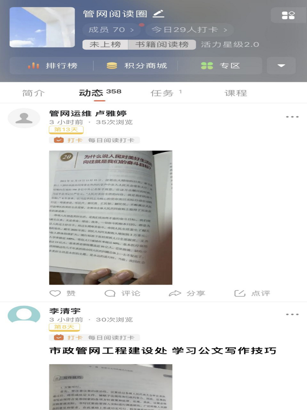 活動(dòng)開(kāi)展以來(lái),各部門(mén)積極響應(yīng),職工利用工作之余每日?qǐng)?jiān)持打卡,有的分享生產(chǎn)技術(shù)專業(yè)知識(shí),有的分享詩(shī)詞經(jīng)典,有的分享名人著作,通過(guò)積極分享發(fā)表讀書(shū)感悟,互相點(diǎn)贊鼓勵(lì),營(yíng)造了“比學(xué)趕超”良好學(xué)習(xí)氛圍。