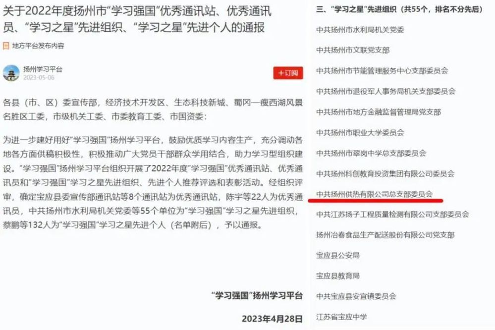 近日,“學(xué)習(xí)強(qiáng)國(guó)”揚(yáng)州學(xué)習(xí)平臺(tái)發(fā)布了《關(guān)于2022年度揚(yáng)州市“學(xué)習(xí)強(qiáng)國(guó)”優(yōu)秀通訊站、優(yōu)秀通訊員、“學(xué)習(xí)之星”先進(jìn)組織、“學(xué)習(xí)之星”先進(jìn)個(gè)人的通報(bào)》,集團(tuán)下屬供熱公司黨總支被表彰為2022年度揚(yáng)州市“學(xué)習(xí)強(qiáng)國(guó)”“學(xué)習(xí)之星”先進(jìn)組織、揚(yáng)州中燃公司蔣勇被表彰為“學(xué)習(xí)之星”先進(jìn)個(gè)人榮譽(yù)稱號(hào)。