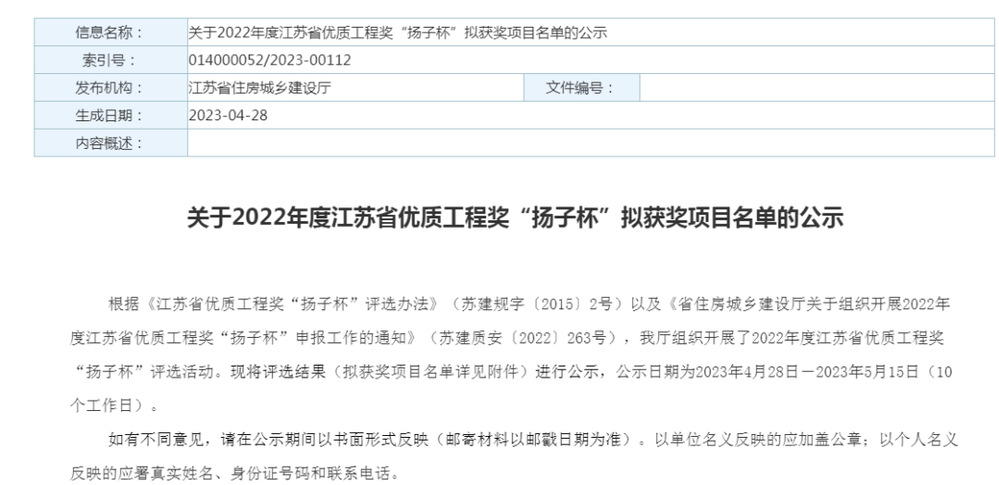 “揚(yáng)子杯”由江蘇省住建廳、江蘇省建筑工程管理局、江蘇省建筑行業(yè)協(xié)會(huì)組織評(píng)選,是全省建筑工程質(zhì)量最高榮譽(yù)獎(jiǎng),評(píng)選對(duì)象為省內(nèi)已經(jīng)建成并投入使用的各類(lèi)建設(shè)工程,每年評(píng)審一次,實(shí)行獲獎(jiǎng)項(xiàng)目總量控制,當(dāng)年獲獎(jiǎng)總量不超過(guò)上一年度竣工驗(yàn)收項(xiàng)目數(shù)量的百分之一。