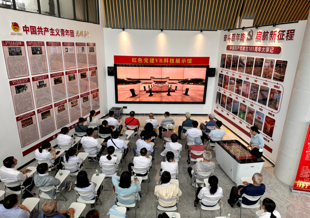 在紅色黨建VR科技展示館內(nèi),黨員集中觀看了紅色視頻,并在紅色講壇前重溫入黨誓詞。大家面對(duì)鮮紅的黨旗,緊握右拳,莊重地重溫入黨誓詞,進(jìn)一步堅(jiān)定了入黨使命和奮斗初心。