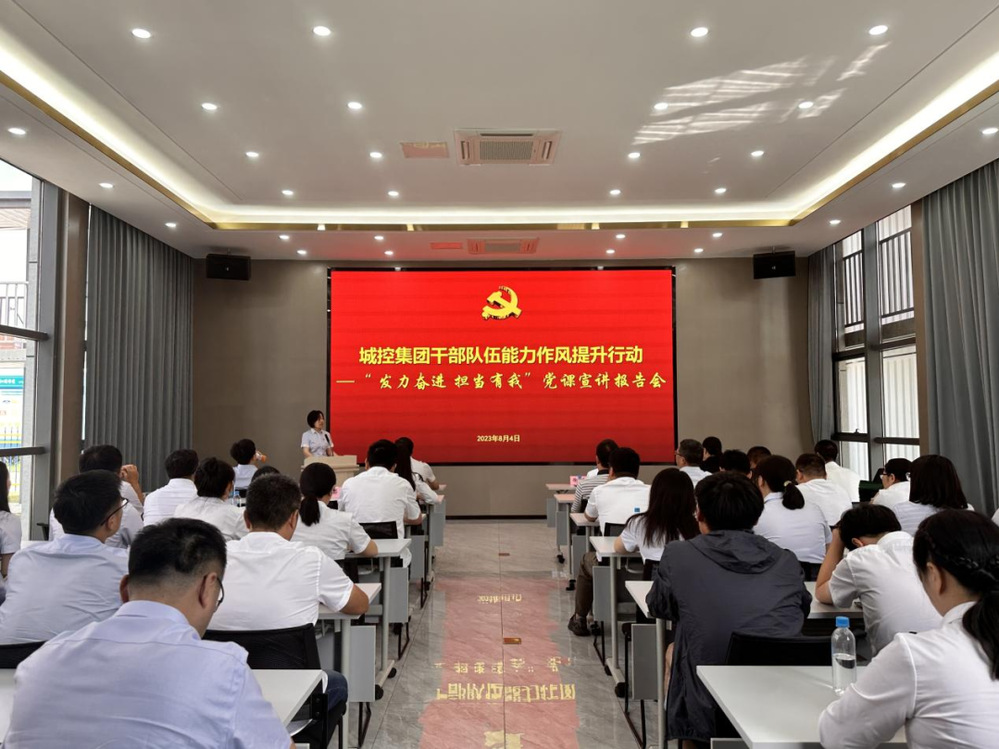 為深入學(xué)習(xí)貫徹習(xí)近平新時(shí)代中國特色社會(huì)主義思想和黨的二十大精神,切實(shí)提升集團(tuán)干部隊(duì)伍能力作風(fēng)建設(shè),8月4日上午,集團(tuán)在城建置業(yè)公司天璟融園項(xiàng)目部舉辦了第一場(chǎng)“發(fā)力奮進(jìn) 擔(dān)當(dāng)有我”黨課宣講報(bào)告會(huì)。集團(tuán)黨委副書記徐飛、集團(tuán)黨群部負(fù)責(zé)人,城建置業(yè)公司領(lǐng)導(dǎo)班子成員、各部門負(fù)責(zé)人、全體黨員,天璟融園項(xiàng)目參建、聯(lián)建單位黨員代表共計(jì)50余人參加活動(dòng)。