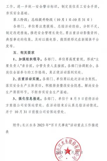 會(huì)議強(qiáng)調(diào),一是提高認(rèn)識(shí),深刻領(lǐng)會(huì)活動(dòng)的重要意義。要充分認(rèn)識(shí)開展此次活動(dòng)的重要意義,把思想和行動(dòng)統(tǒng)一到公司的決策部署上來;各相關(guān)部門要精心組織,以開展各項(xiàng)活動(dòng)促進(jìn)安全生產(chǎn)管理,確保安全工作平穩(wěn)有序。二是履職盡責(zé),準(zhǔn)確把握活動(dòng)的目標(biāo)重點(diǎn)。進(jìn)一步落實(shí)全員安全生產(chǎn)責(zé)任制,將安全責(zé)任落實(shí)到生產(chǎn)一線和施工現(xiàn)場(chǎng);進(jìn)一步落實(shí)安全生產(chǎn)關(guān)鍵環(huán)節(jié)風(fēng)險(xiǎn)管控措施,努力將安全生產(chǎn)由事后處置向事前預(yù)防、事中控制轉(zhuǎn)變;進(jìn)一步加強(qiáng)安全生產(chǎn)管理常態(tài)機(jī)制建設(shè),完善各類應(yīng)急預(yù)案,加強(qiáng)應(yīng)急隊(duì)伍建設(shè);進(jìn)一步加強(qiáng)安全標(biāo)準(zhǔn)化建設(shè)和精細(xì)化管理,深入開展生產(chǎn)運(yùn)維和工程施工安全隱患排查治理,落實(shí)防觸電、防高墜、防火災(zāi)等安全措施。三是加強(qiáng)領(lǐng)導(dǎo),切實(shí)抓好活動(dòng)的組織實(shí)施。加強(qiáng)活動(dòng)的統(tǒng)一組織、動(dòng)員宣傳和過程管控,以求真務(wù)實(shí)的工作作風(fēng)、嚴(yán)謹(jǐn)高效的工作標(biāo)準(zhǔn)、不折不扣的執(zhí)行要求,切實(shí)抓好活動(dòng)的組織和實(shí)施。