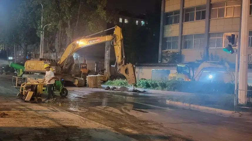 過(guò)路施工從7日晚上22時(shí)開始,施工現(xiàn)場(chǎng)熱火朝天,挖機(jī)、破碎機(jī)等大型機(jī)械輪番上陣。路口處,專人做好交通疏導(dǎo),確保行車有序;各作業(yè)面協(xié)調(diào)配合,管理人員合理調(diào)度;每一處都分秒必爭(zhēng),每一道工序都緊密銜接?!暗孛嫫坡?、給水管道鋪設(shè)、管道焊接全都要趕在第二天交通早高峰到來(lái)前完成,不能影響群眾上班、生活。”項(xiàng)目負(fù)責(zé)人下達(dá)指令。在施工人員徹夜奮戰(zhàn)下,8日凌晨5點(diǎn),施工順利完成。