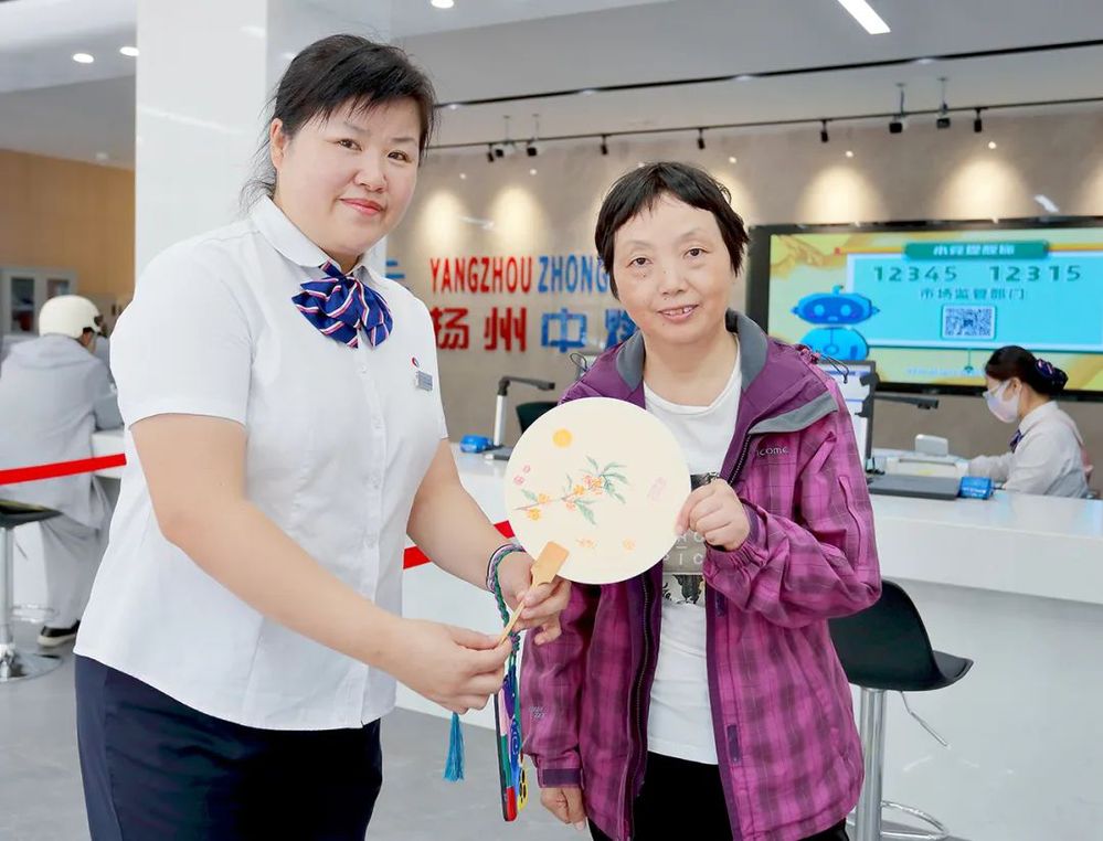 團扇寓意著團團圓圓、家庭美滿、闔家歡樂。貼上萬年紅方宣,飽蘸一得閣墨汁,中秋安康,平安喜樂,氣聚人和、但愿人長久、千里共嬋娟……一幅幅墨寶被志愿者賦予了濃情和溫度,一張張笑臉隨筆墨齊飛揚。前來辦理業(yè)務(wù)的戚女士也是書法愛好者,與志愿者們交流切磋,現(xiàn)場即興書寫了一把小楷“花好月圓”團扇,開心地說:感謝揚州中燃提供的互動平臺,過了一把癮;印刷的書畫團扇花錢隨處都能買到,但我還是喜歡手寫的,有溫度、接地氣,每一幅都是獨一無二的,福氣滿滿、韻味濃濃。