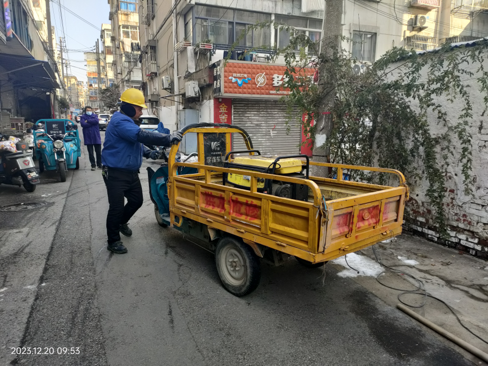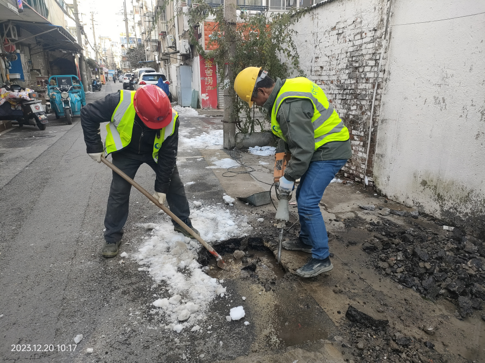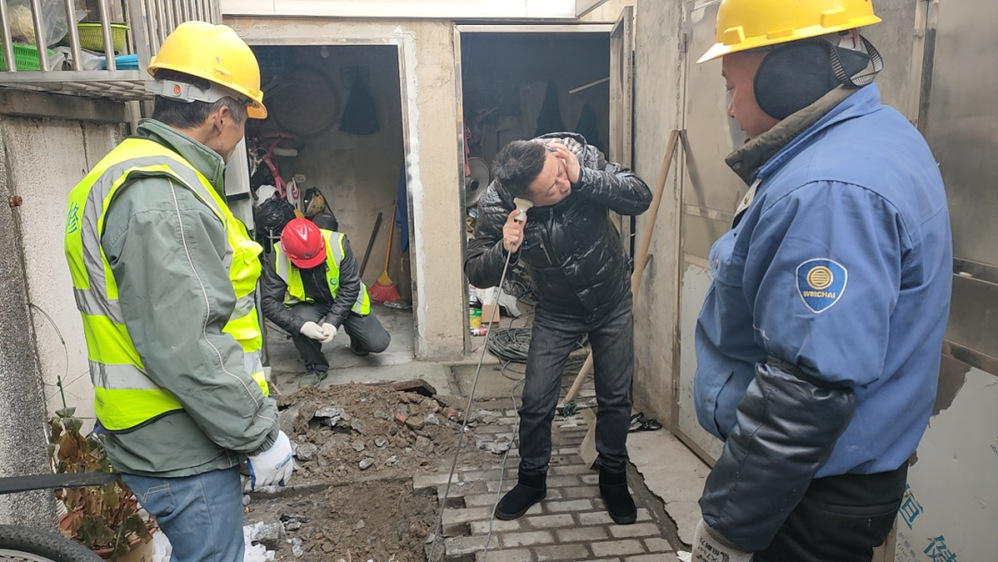 接到報(bào)修電話后,長(zhǎng)江水務(wù)搶維修中心搶修人員立即趕到現(xiàn)場(chǎng),細(xì)致查勘確定是表前PE63管道凍裂漏水造成水壓變小。嚴(yán)寒天氣下,地面凍得很硬,為方便搶修施工,搶維修中心又調(diào)來(lái)挖掘機(jī)開(kāi)挖基坑,搶修人員冒著零度以下的嚴(yán)寒關(guān)閉閘門(mén)、停水搶修。在修復(fù)凍裂的管道后,供水搶修負(fù)責(zé)人到王大姐家打開(kāi)水龍頭,檢查水壓是否正常,在獲得王大姐的滿意答復(fù)后才離開(kāi)現(xiàn)場(chǎng)。在搶修尾聲,供水搶修人員又接到馬太巷居民報(bào)修處理的工單,搶修人員稍作休息又趕赴下一站。