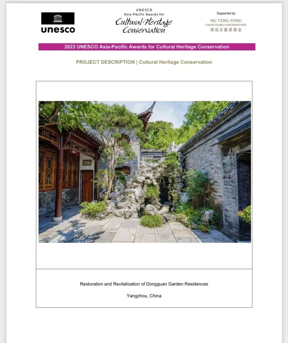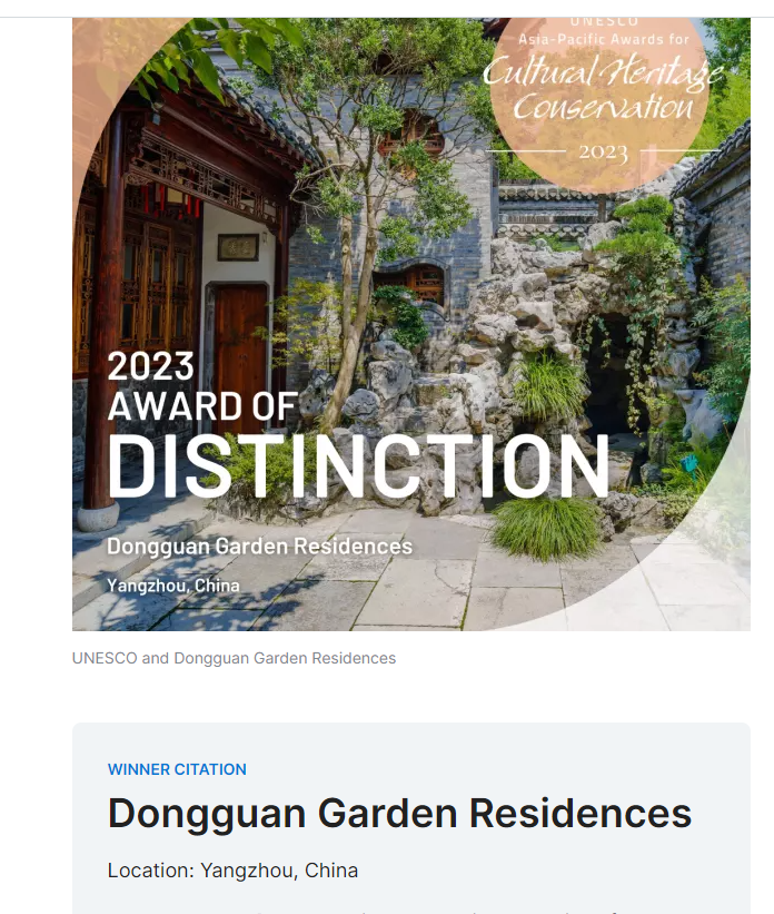 由揚(yáng)州市住房和城鄉(xiāng)建設(shè)局組織,揚(yáng)州市名城建設(shè)有限公司牽頭申報的“揚(yáng)州東關(guān)街園宅保護(hù)與傳承復(fù)興項目”榮獲2023年度“聯(lián)合國教科文組織亞太地區(qū)文化遺產(chǎn)保護(hù)杰出獎”。此次共有從來自亞洲地區(qū)和太平洋沿岸地區(qū)的8個國家、48個城市項目申報,最終有12個項目獲獎。