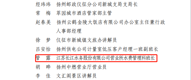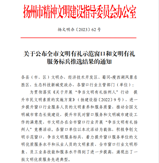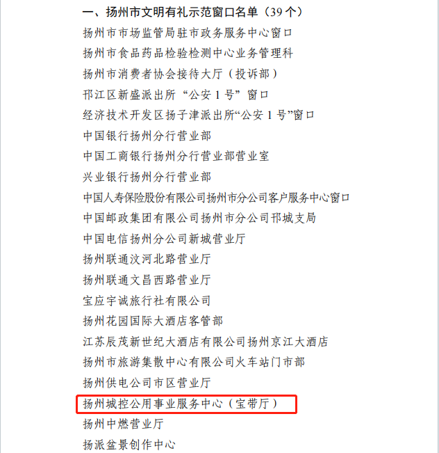 在揚州市精神文明建設指導委員會辦公室組織的“爭當文明有禮揚州人”競賽活動中,揚州城控公用事業(yè)服務中心(寶帶廳)被評選為全市文明有禮示范窗口,營業(yè)大廳水費管理科管露同志被評選為揚州市文明有禮服務標兵。