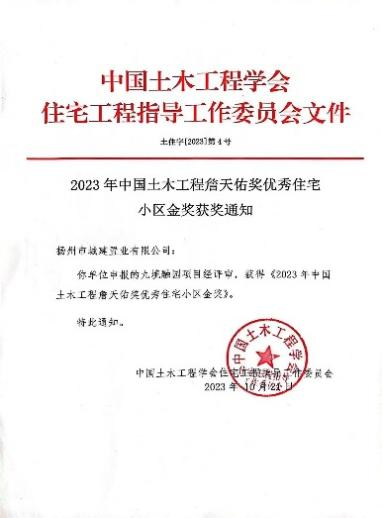 近日,從中國土木工程學(xué)會住宅工程指導(dǎo)委員會傳來喜訊,由置業(yè)公司開發(fā)申報(bào)的九境融園住宅項(xiàng)目榮獲“2023中國土木工程詹天佑獎優(yōu)秀住宅小區(qū)金獎”。