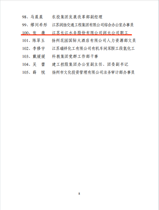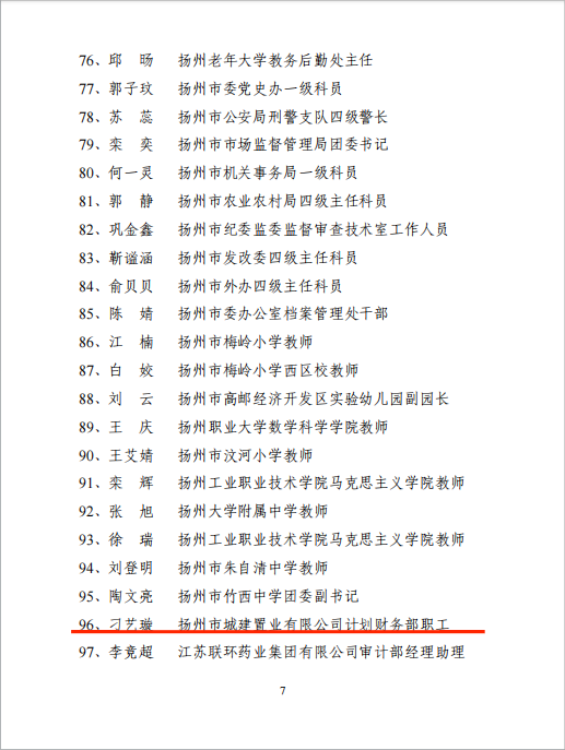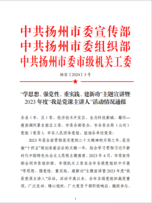 近日,市委宣傳部、市委組織部、市級(jí)機(jī)關(guān)工委下發(fā)了《“學(xué)思想、強(qiáng)黨性、重實(shí)踐、建新功”主題宣講暨2023年度“我是黨課主講人”活動(dòng)情況通報(bào)》,城控集團(tuán)選送的2名選手——揚(yáng)州市城建置業(yè)有限公司刁藝璇、江蘇長江水務(wù)股份有限公司張薇被評(píng)為2023年度揚(yáng)州市“優(yōu)秀黨課主講人”。