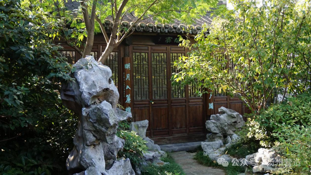 在七峰之下有一間石屋,即假山間的石洞,是文人墨客的一種趣味所在?!安煌咭嗖淮?,依稀善卷洞”,善卷洞是宜興的石灰石溶洞,這里的假山洞——石屋,即便確實(shí)有,規(guī)模也不能與之相比,文人雅士的即興比喻而已。