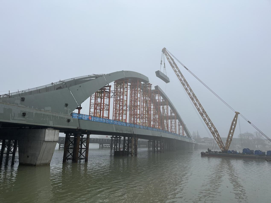1月30日,隨著最后一段拱肋緩緩吊裝至合攏位置,歷時(shí)一年,壁虎河大橋鋼箱提籃拱橋主拱順利合攏,標(biāo)志著該項(xiàng)目取得了重要節(jié)點(diǎn)突破。