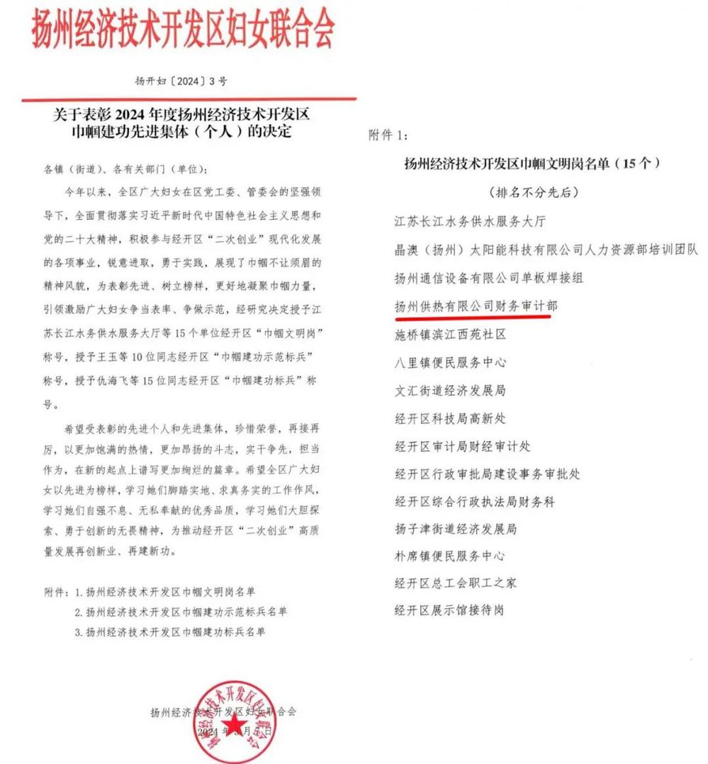 在第114個(gè)“三八”國(guó)際婦女節(jié)來(lái)臨之際,供熱公司多個(gè)女工集體和個(gè)人獲表彰,黨工部主管及紀(jì)檢監(jiān)察員張娟榮獲“江蘇省住房城鄉(xiāng)建設(shè)系統(tǒng)五一巾幗標(biāo)兵”稱號(hào),財(cái)務(wù)審計(jì)部榮獲“揚(yáng)州經(jīng)濟(jì)技術(shù)開發(fā)區(qū)巾幗文明崗”稱號(hào)。