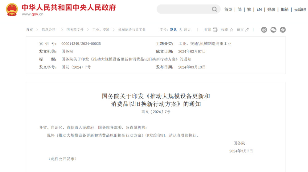 日前,國(guó)務(wù)院印發(fā)《推動(dòng)大規(guī)模設(shè)備更新和消費(fèi)品以舊換新行動(dòng)方案》(以下簡(jiǎn)稱(chēng)《行動(dòng)方案》)。