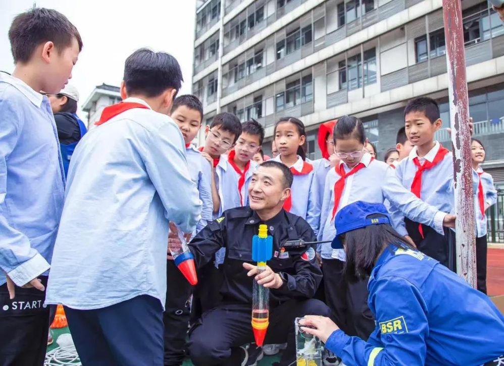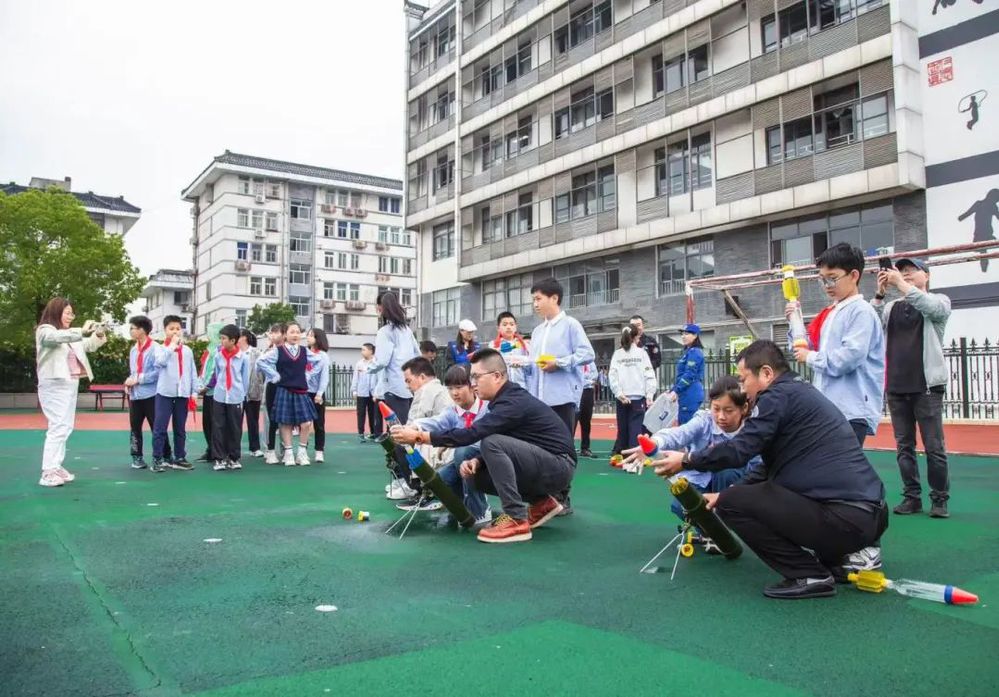 在這場(chǎng)專為1000名師生打造的科普盛宴中,揚(yáng)州中燃藍(lán)焰志愿者根據(jù)安排負(fù)責(zé)室外“水火箭迫擊炮”項(xiàng)目。為了讓學(xué)生們有更好地體驗(yàn)感受,藍(lán)焰志愿者們當(dāng)天6:50就來(lái)到校園開(kāi)展準(zhǔn)備工作,在揚(yáng)州北藍(lán)救援隊(duì)專業(yè)人員指導(dǎo)下,熟悉掌握操作流程。隨著科技節(jié)的啟動(dòng),大家各司其職、恪守安全要領(lǐng),有的負(fù)責(zé)填充注水、有的負(fù)責(zé)打氣增壓、有的負(fù)責(zé)裝“彈”射擊,確保整個(gè)活動(dòng)有條不紊?!翱萍即嬖诜殴獠?,人人爭(zhēng)相為此來(lái)”。學(xué)生們?cè)谥驹刚叩闹笇?dǎo)下,體驗(yàn)了“水火箭迫擊炮”發(fā)射的整個(gè)過(guò)程,同時(shí)也了解了“空氣的作用力和反作用力”的實(shí)驗(yàn)原理,每一發(fā)“火箭彈”的成功發(fā)射都引來(lái)陣陣哇噻聲。至中午12時(shí)許,活動(dòng)圓滿結(jié)束,藍(lán)焰志愿者用行動(dòng)在孩子們心中撒下科學(xué)的種子,營(yíng)造出了熱愛(ài)科學(xué)、崇尚科學(xué)的氛圍。