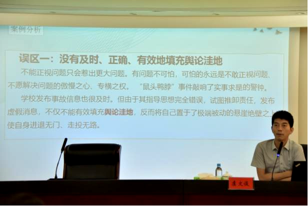 首先由揚(yáng)州市應(yīng)急管理綜合行政執(zhí)法監(jiān)督局二大隊(duì)大隊(duì)長(zhǎng)丁小雅從危險(xiǎn)源識(shí)別與風(fēng)險(xiǎn)評(píng)價(jià)、常見供水事故案例與預(yù)防措施、事故報(bào)告與應(yīng)急響應(yīng)等方面為大家進(jìn)行了講解。此外,公司還邀請(qǐng)了揚(yáng)州大學(xué)新聞與傳媒學(xué)院專業(yè)主任虞文俊教授重點(diǎn)講解突發(fā)公共事件輿情的形成、發(fā)展以及處理的方法和技巧。