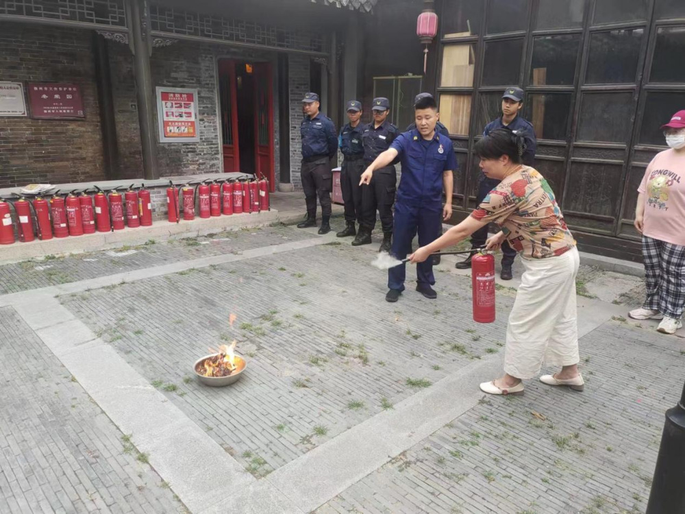 為進(jìn)一步加強(qiáng)已租賃文物建筑火災(zāi)防控能力,增強(qiáng)文物建筑從業(yè)人員消防安全防范意識和突發(fā)事件應(yīng)變能力,確保文物建筑物的消防安全,6月26日下午,名城公司東關(guān)街經(jīng)營管理公司邀請廣陵區(qū)消防大隊宣傳員,在省級文保單位冬榮園內(nèi)進(jìn)行了消防安全應(yīng)急演練,街區(qū)安保人員、文保單位從業(yè)人員參加演練。