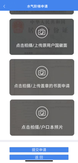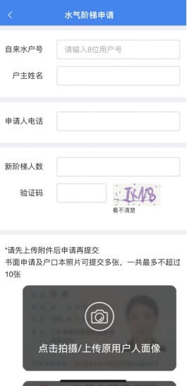 05填寫業(yè)務(wù)辦理信息根據(jù)自身情況填寫“自來水/燃?xì)鈶籼?hào)”、“戶主姓名”、“申請(qǐng)人電話”、“新階梯人數(shù)”,上傳身份證正反面照片(必須項(xiàng)),若戶口本人口數(shù)與新階梯人數(shù)一致,上傳戶口本照片即可提交申請(qǐng)。(若不一致,還需在申請(qǐng)說明頁面下載“證明模板”填寫并蓋章后上傳,照片最多上傳10張哦~)