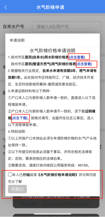 04查看申請(qǐng)說明瀏覽申請(qǐng)說明的各事項(xiàng),查看階梯價(jià)格表、可辦理地區(qū)、所需材料等內(nèi)容,勾選知曉和同意按鈕后,進(jìn)入業(yè)務(wù)辦理界面。