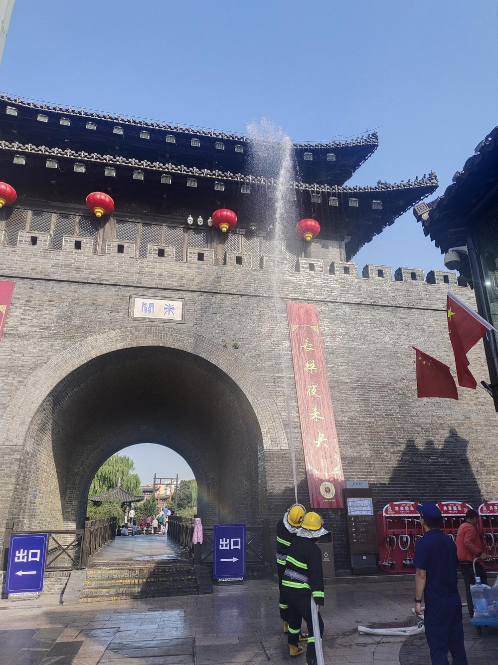 此次演練以實(shí)戰(zhàn)的角度出發(fā),測(cè)算水帶干線的鋪設(shè)距離、水槍陣地設(shè)置、力量部署、車輛的位置??康刃畔ⅰQ菥毲?,安保人員再次對(duì)消防通道、室外消火栓布局、水源分布、電源位置等情況逐一查看。隨后,模擬街區(qū)最高點(diǎn)城門樓重檐頂部起火,根據(jù)前期制定的滅火救援方案從多角度、多位置對(duì)火災(zāi)位置進(jìn)行滅火救援,演練過(guò)程中個(gè)個(gè)精神飽滿,安保人員配合默契,動(dòng)作準(zhǔn)確迅速,圓滿完成了此次演習(xí)任務(wù)。通過(guò)開展此次針對(duì)性的培訓(xùn)演練,擰緊了街區(qū)安保和附近商戶的“安全弦”,加強(qiáng)了街區(qū)消防安全處置能力,提升了安保滅火救援實(shí)戰(zhàn)能力,為東關(guān)街安全生產(chǎn)工作提供了更好的保障。