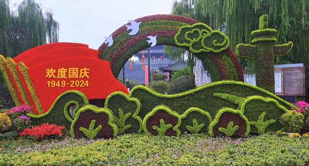 主游路沿線上東關(guān)街巷打卡墻處花壇,打造的“祖國(guó)繁榮”綠雕景觀讓人眼前一亮,郁郁蔥蔥的景框與翠綠的枝葉相映成趣,各色花卉構(gòu)成了一幅靚麗的風(fēng)景線,通過(guò)造型各異的動(dòng)物園林小品,以靈動(dòng)的方式向祖國(guó)母親獻(xiàn)上最真摯的祝福。國(guó)慶節(jié)前,新的綠雕打卡地布置工作已經(jīng)全部完成,提升了東關(guān)街景區(qū)內(nèi)的景觀品質(zhì),為游客營(yíng)造喜慶熱烈的節(jié)日氛圍。