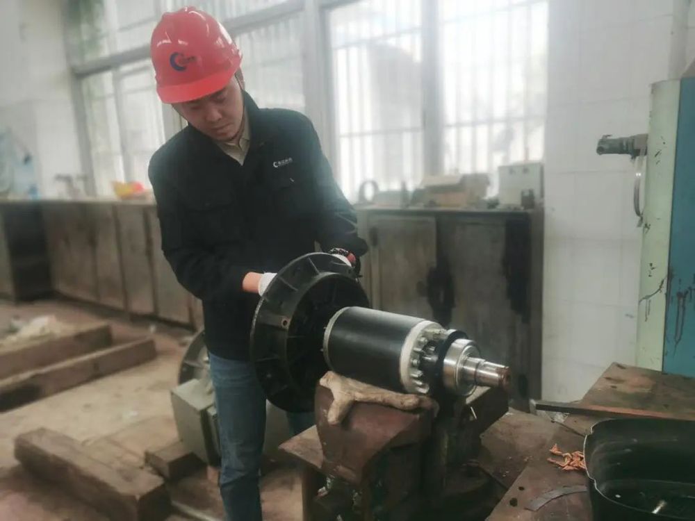 拆卸過程中,技術人員面臨安裝位置狹窄、操作空間有限等問題,但他們毫不退縮,憑借精湛技術及頑強毅力,順利完成故障電機拆卸工作。故障電機運抵修理車間后,技術人員爭分奪秒更換新軸承,并連續(xù)奮戰(zhàn)24小時完成維修,隨后對2號水泵葉輪等關鍵部件進行全面調(diào)試。最終,2號水泵恢復平穩(wěn)運轉(zhuǎn),清澈水流重新輸送至文昌府居民家中。