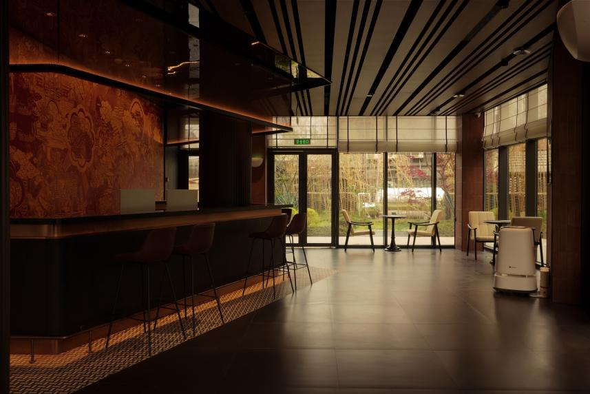 酒店原身是漆器二廠的舊廠房,藏著揚(yáng)州匠人幾十載的光陰。如今門口墻柱上歷經(jīng)風(fēng)雨的廠牌被重新描金,那些被時(shí)光浸潤的梁柱,被歲月打磨的磚墻,以全新的姿態(tài)言說歷史。黑推光作天,朱漆為地,金彩點(diǎn)晴。酒店設(shè)計(jì)師將封存于漆器中的古老色譜解構(gòu)重生。以玄黑為底,朱紅作紋,金屬點(diǎn)晴,墻面被光影切割,暗紅與玄黑交織的紋理中,隱約可見匠人指尖的溫度。