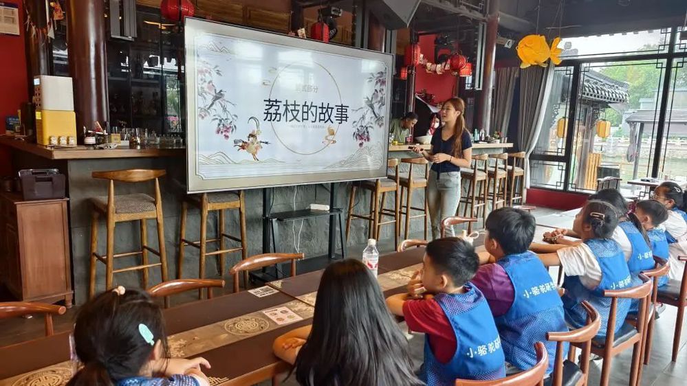 孩子們在老師的帶領下走進淮揚菜博物館,從古籍記載的飲食習俗,到非遺傳承人的技藝展示,大家一邊觀察飲食文物,一邊聆聽講解,在互動中了解到淮揚菜與古代飲食文化的深厚關聯(lián)。緊隨其后的唐朝詭事錄VR劇場成為活動高潮,孩子們戴上VR眼鏡,瞬間“穿越”至盛唐街頭,化身“小偵探”跟隨劇情線索探尋關于荔枝的謎題。虛實交織的場景、生動有趣的互動,讓抽象的歷史故事變得可感可觸?;顒游猜?,孩子們圍坐一堂開啟“荔枝課堂”,老師從杜牧“一騎紅塵妃子笑”的詩句切入,講解荔枝的歷史典故、生長特性與文化寓意,讓孩子們在詩詞與美食的碰撞中深化認知。最后,孩子們親手將新鮮荔枝制成清甜飲品,在動手過程中體會“勞動創(chuàng)造美味”的樂趣。