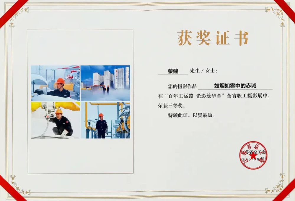 近日,江蘇省總工會(huì)主辦的“百年工運(yùn)路 光影繪華章”全省職工攝影展公布獲獎(jiǎng)情況,揚(yáng)州中燃公司黨群工作部蔡建的攝影組圖作品《如煙如霧中的赤誠》榮獲三等獎(jiǎng)。