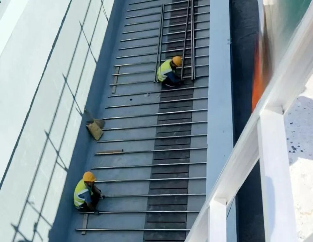 在生物反應池作業(yè)面上,正在進行火燒板貼面安裝的黃師傅是眾多堅守者中的一員。黃師傅說“為了搶進度,除了中秋節(jié)下午放了半天假,整個假期我們都在工地上”。工地每天清晨5點半開始運轉,施工人員到崗后首先參加安全例會和班前教育,明確當日任務后,便立即投入緊張作業(yè)。這份堅守,不僅體現(xiàn)了建設者對崗位的盡責,更寄托著對項目早日建成投運的期盼。