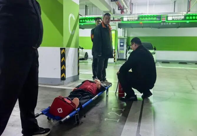 本次演習模擬地下車庫充電樁線路因短路引發(fā)起火、濃煙蔓延的險情。煙感報警觸發(fā)后,商場立即啟動充電樁火災(zāi)應(yīng)急預(yù)案,各專項小組嚴格按照預(yù)案要求高效聯(lián)動:警戒組快速劃定警戒區(qū)域;通訊組精準通知車庫內(nèi)車主緊急移車;疏散組引導(dǎo)商戶及工作人員沿指示標識撤離;滅火組穿戴專業(yè)防護裝備,嚴格遵循“斷電優(yōu)先、精準撲救”的處置原則,成功撲滅模擬火情。